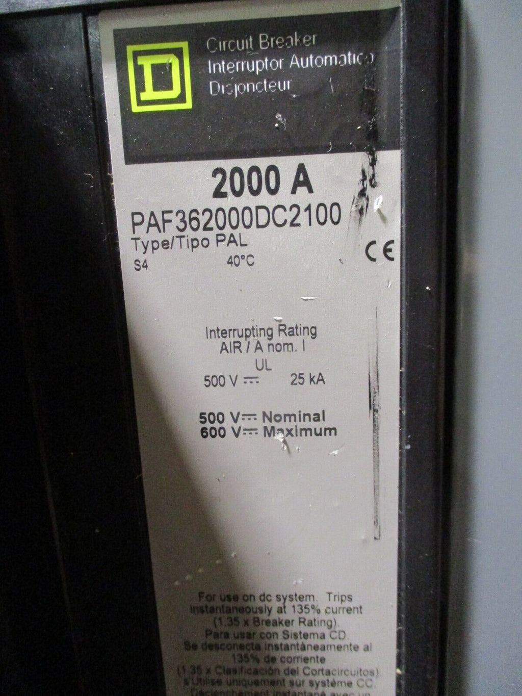 Square D DC Breaker Disconnect PAF362000DC2100 2000A 500VDC Encl: 19410373-001