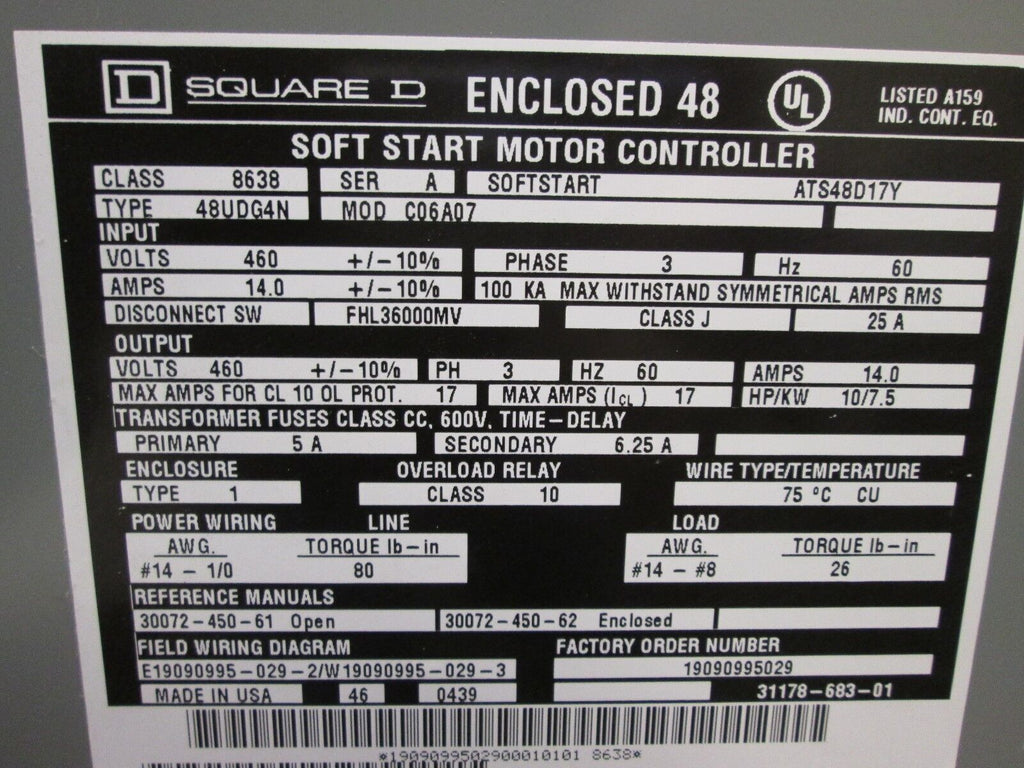 Square D Enclosed 48 Soft Start 863848UDG4N ATS48D17Y Used_x000D_ Condition: UsedBrand: Square DModel: Enclosed 48 Soft StartMPN: 863848UDG4N Square D Enclosed 48 Soft Start 863848UDG4N ATS48D17Y Used Condition: UsedBrand: Square DModel: Enclosed 48 Soft StartMPN: 863848UDG4N Square D Enclosed 48 Softstart 863848UDG4N ATS48D17Y 10HP Altistart 48 Inputs: 460V 14.0A 3PH 60HZ Outputs: 460V 14.0A 3PH 60HZ 7.5KW Used loc: 8g1-7