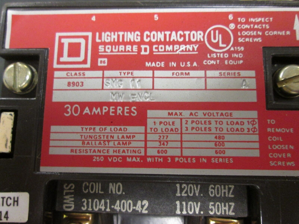 Square D Enclosed Lighting Contactor 8903 SMG 11 30A 120V Coil Used_x000D_ Condition: UsedBrand: Square DMPN: 8903 SMG 11 Square D Enclosed Lighting Contactor 8903 SMG 11 30A 120V Coil Used Condition: UsedBrand: Square DMPN: 8903 SMG 11 Square D Enclosed Lighting Contator Part # 8903 SMG 11 30A 120V Coil Used LOC 19K4-7