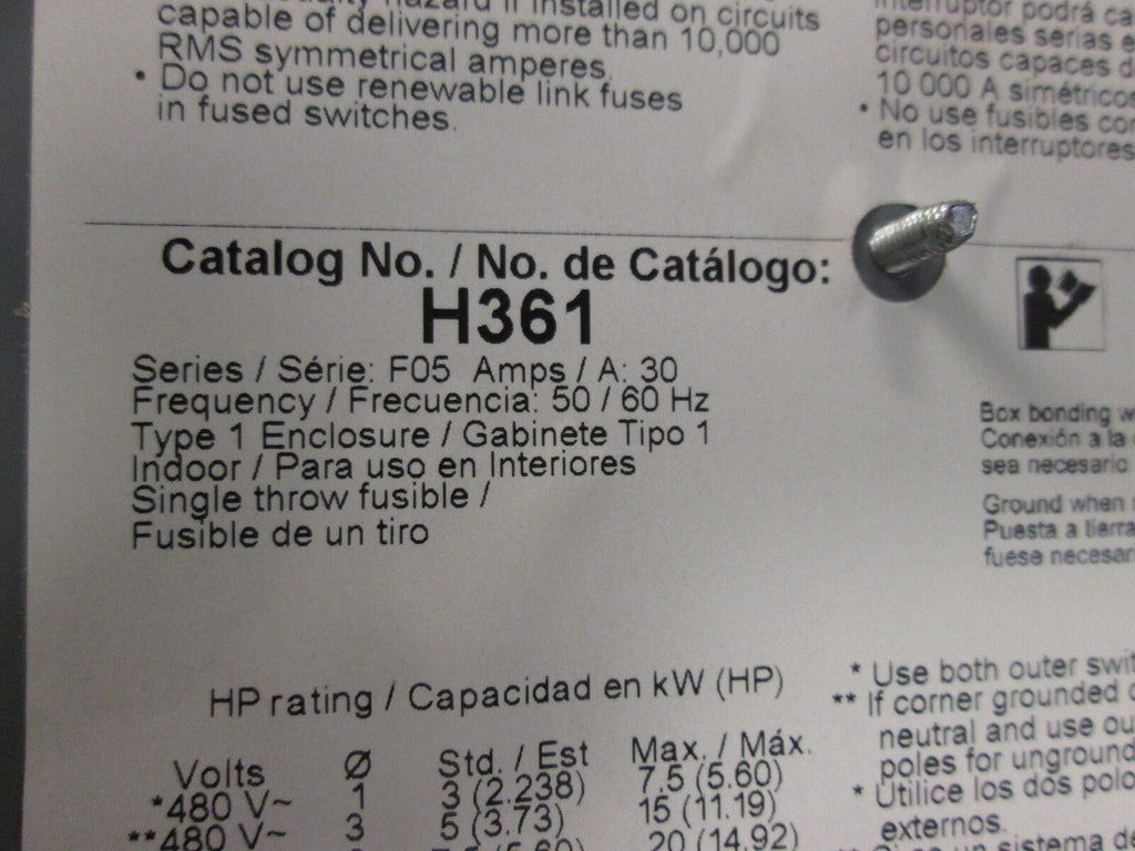 Square D Fusible Safety Switch H361 30A 600V 3P Used