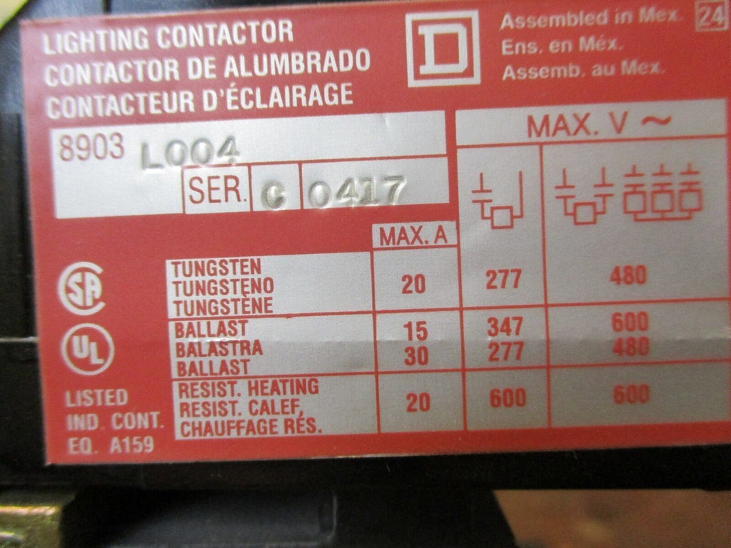 Square D Lighting Contactor 8903 L004 20A 600V 120V Coil Used Condition: UsedBrand: Square DMPN: 8903 L004 Square D Lighting Contactor 8903 L004 20A 600V 120V Coil Used Condition: UsedBrand: Square DMPN: 8903 L004 Square D Lighting Contactor Part # 8903 L004 20A 600V 120V Coil Used LOC 14G2-22