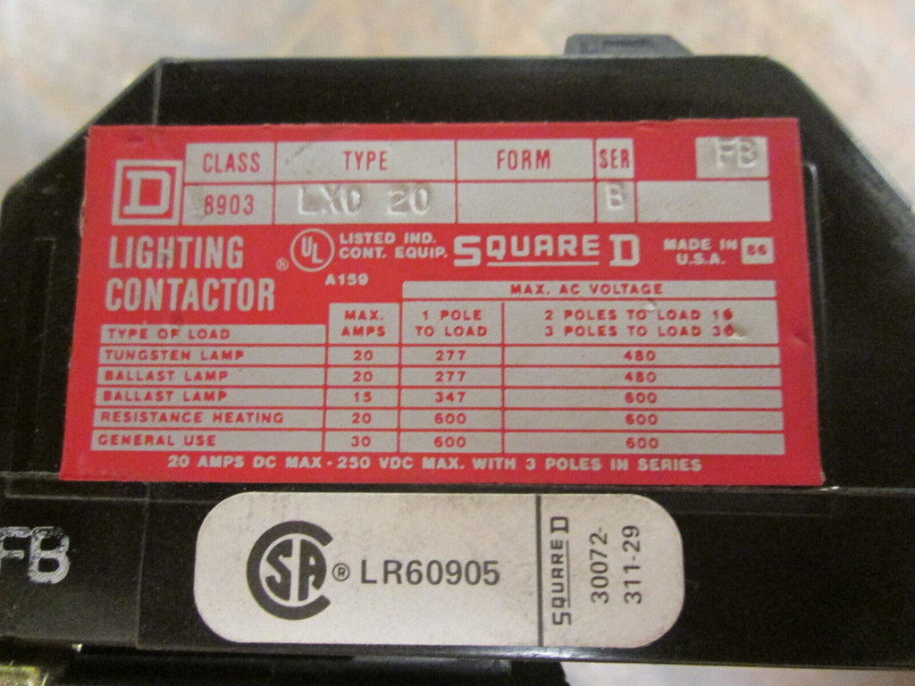 Square D Lighting Contactor 8903 LX0 20 120V Coil 20A 250VDC/600VAC Used