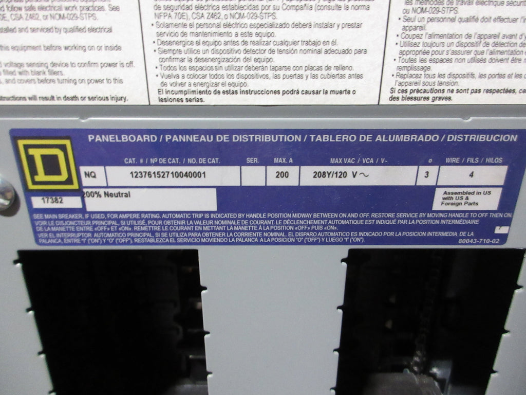 Square D Main Lug Breaker Panel 12376152710040001 200A 208/120V 3Ph 4W Used
