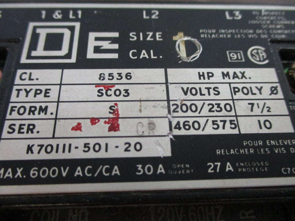 Square D Size 1 Starter 8536 SC03 S Ser. A 120V Coil 600V *Heaters May Vary*