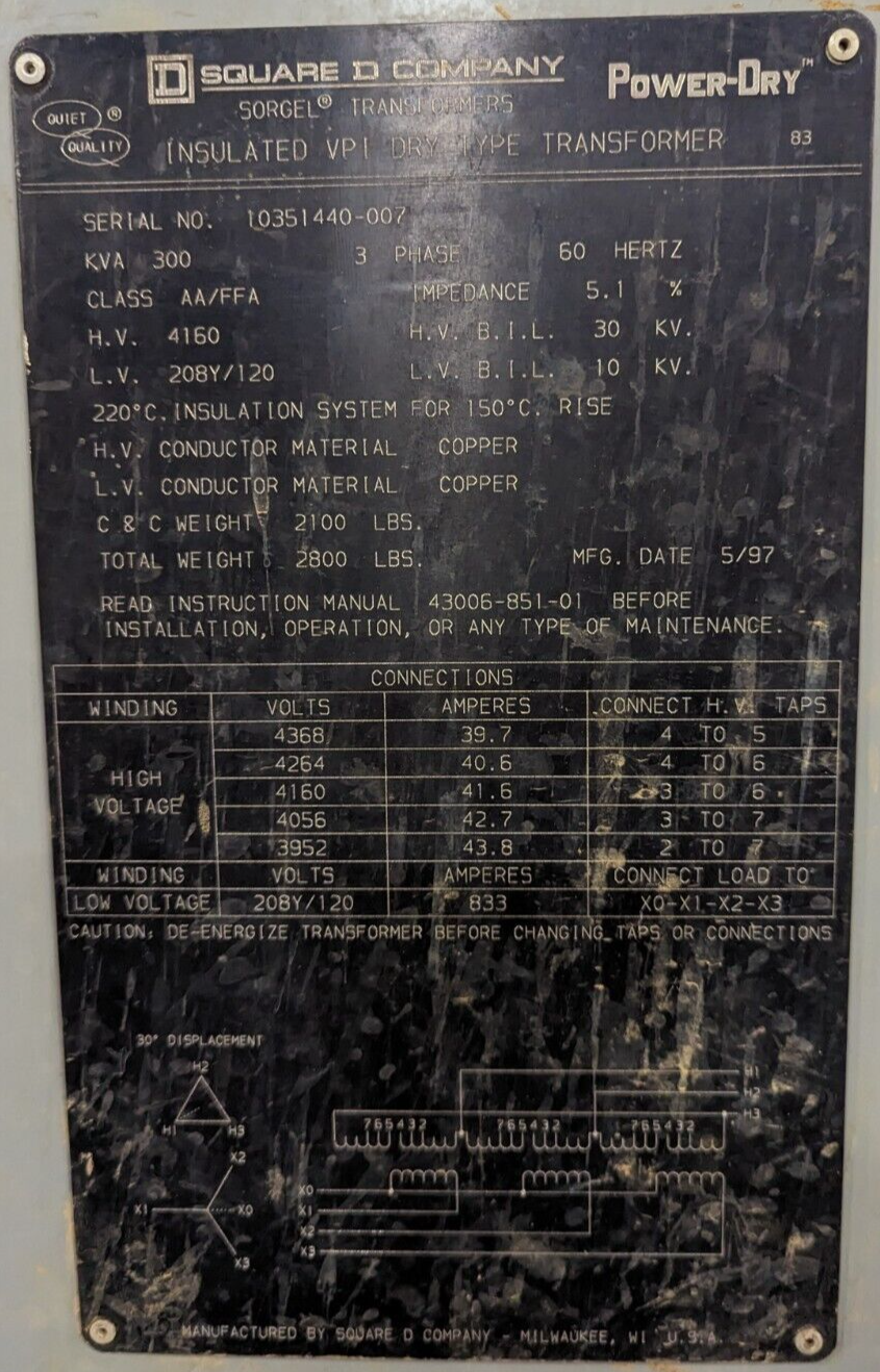 Square D Sorgel Transformer 300 kVA Pri: 4160 V Sec: 208Y/120 V 3Ph 60 Hz UsedLoc: AB11-5945- 300 kVA
