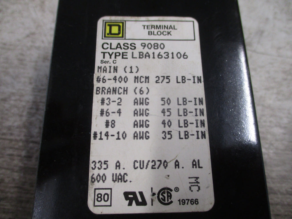 Square D Terminal Block 9080LBA163106 335A 600V 1P Line (1): #6-400 Load (6): #3-2 / #6-4 / #8 / #14-10 Used LOC 58A3-36