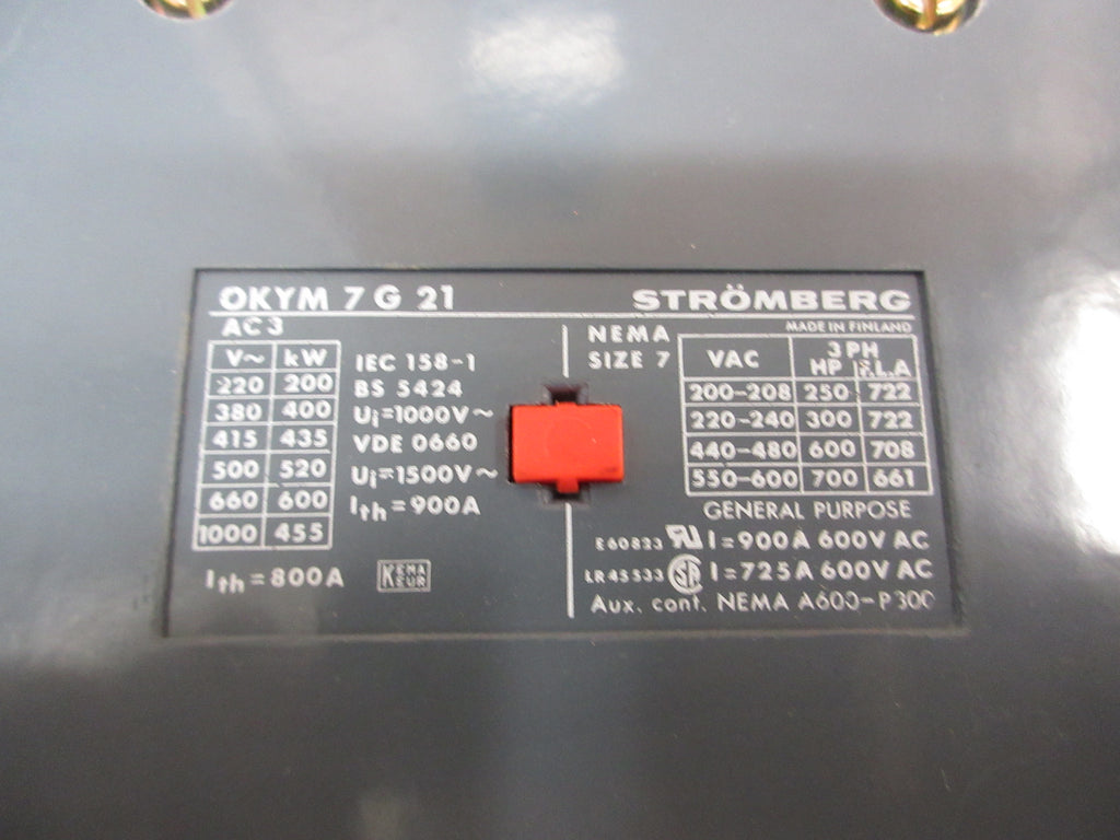 Stromberg Size 7 Contactor Part #: OKYM 7 G 21 125 V Coil (2) Terminal Covers *Broken Cover* Used Loc: AB11-8471 / AB29E2