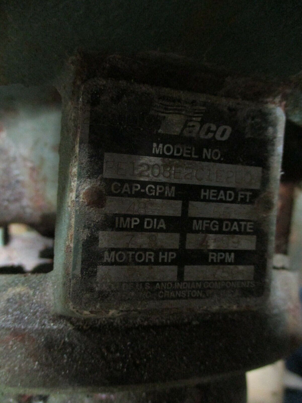 Taco Pump Part #: FE1208E2C1E2L0A 2HP 1750RPM 48GPM 55ft Head UsedWeight: 350 lbsLOC AB11-3093 / AB36C2- Taco Pump