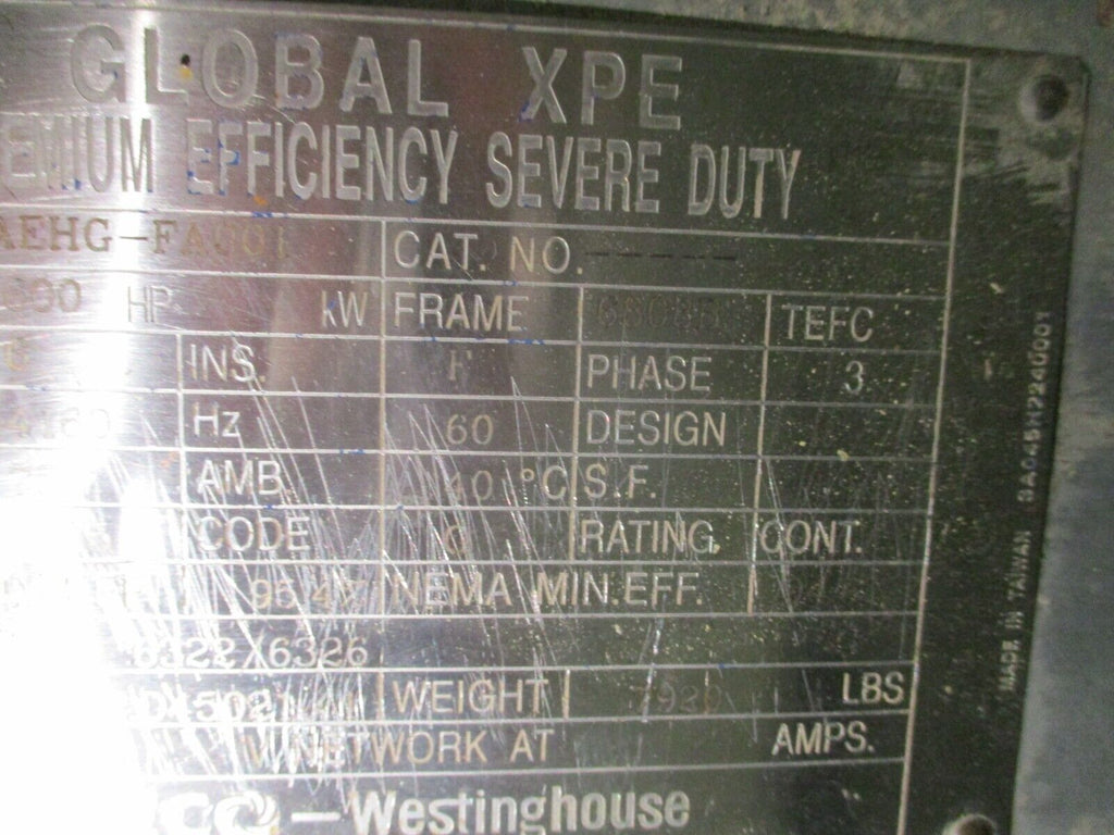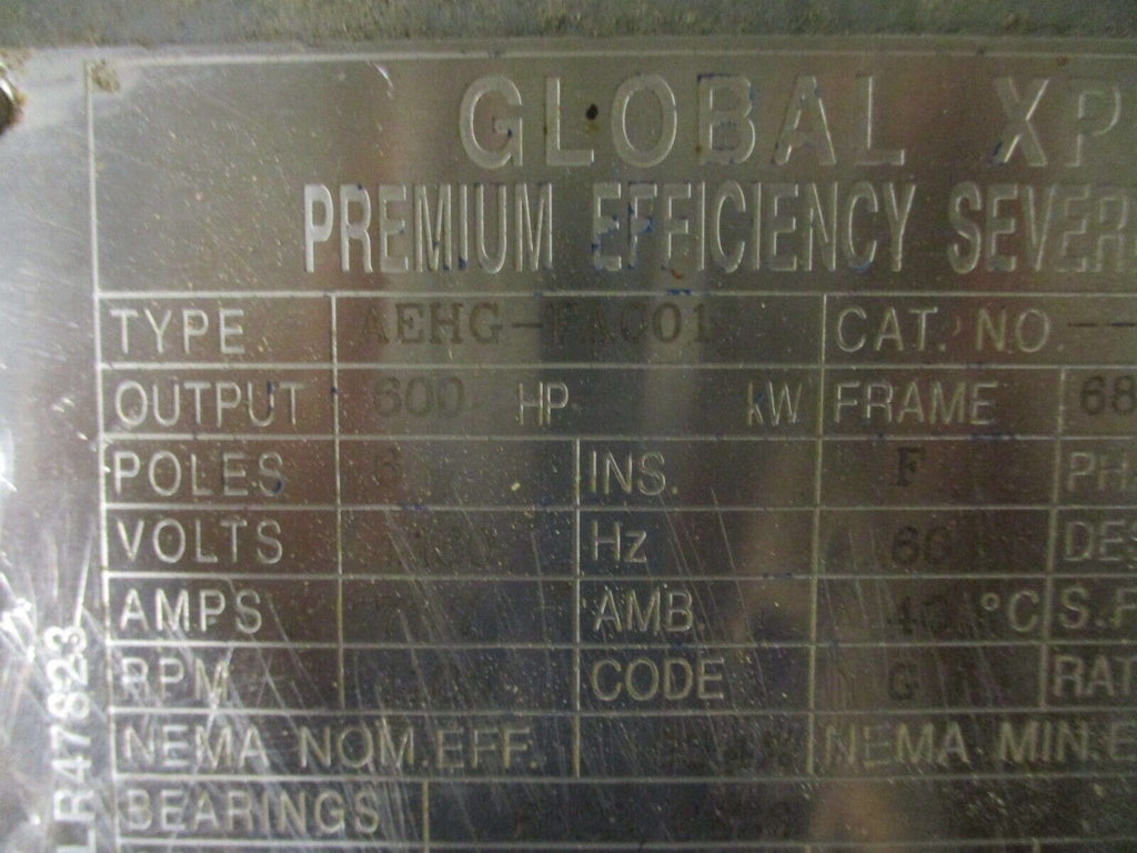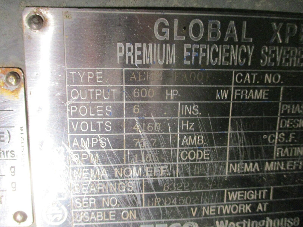 Teco-Westinghouse Global XPE Severe Duty AC Motor AEHG-FA001 600HP 4160V 1200RPM_x000D_ Condition: UsedEnclosure Type: TEFC (Totally Enclosed Fan Cooled)AC Frequency Rating: 60 HzCurrent Type: ACAC Phase: Three PhaseMPN: AEHG-FA001Rated Load (HP): 600Special Motor Construction: Severe Duty MotorBrand: WestinghouseNominal Rated Input Voltage: 4160 V Teco-Westinghouse Global XPE Severe Duty AC Motor AEHG-FA001 600HP 4160V 1200RPM Condition: UsedEnclosure Type: TEFC (Totally Enclosed Fan Cooled)AC Frequency Rating: 60 HzCurrent Type: ACAC Phase: Three PhaseMPN: AEHG-FA001Rated Load (HP): 600Special Motor Construction: Severe Duty MotorBrand: WestinghouseNominal Rated Input Voltage: 4160 V Teco-Westinghouse Global XPE Severe Duty AC Motor Part #: AEHG-FA001 600HP 4160V 6P 75.7A 3Ph 60Hz 1185RPM TEFC Enclosure 6808B Frame Used Weight: 8000 lbs. LOC AB11-4031