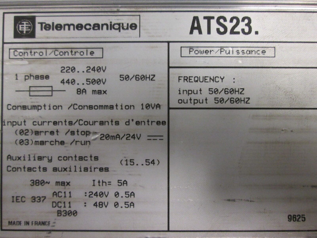 Telemecanique Altistart 3 Soft Start ATS23.D44N 30HP / 15HP 208/230/460V Telemecanique Altistart 3 Soft Start ATS23.D44N 30HP / 15HP 208/230/460V**Broken Cover**Condition: UsedLoc: 2h3-4 Telemecanique Altistart 3 Soft Start ATS23.D44N 30HP / 15HP 208/230/460V**Broken Cover**Condition: UsédLoc: 2h3-4