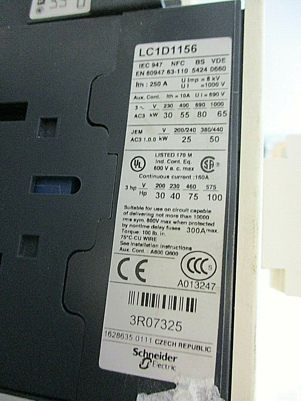 Telemecanique Contactor LC1D1156 24V Coil 160A 600V w/Aux Contact Block Used_x000D_ Condition: UsedCountry/Region of Manufacture: Czech RepublicMPN: LC1D1156Coil Volts: 24 VACBrand: Telemecanique Telemecanique Contactor LC1D1156 24V Coil 160A 600V w/Aux Contact Block Used Condition: UsedCountry/Region of Manufacture: Czech RepublicMPN: LC1D1156Coil Volts: 24 VACBrand: TelemecaniqueTelemecanique Contactor Part#: LC1D1156 24V Coil 160A 600V w/Aux Contact Block Used loc: 11K3-48