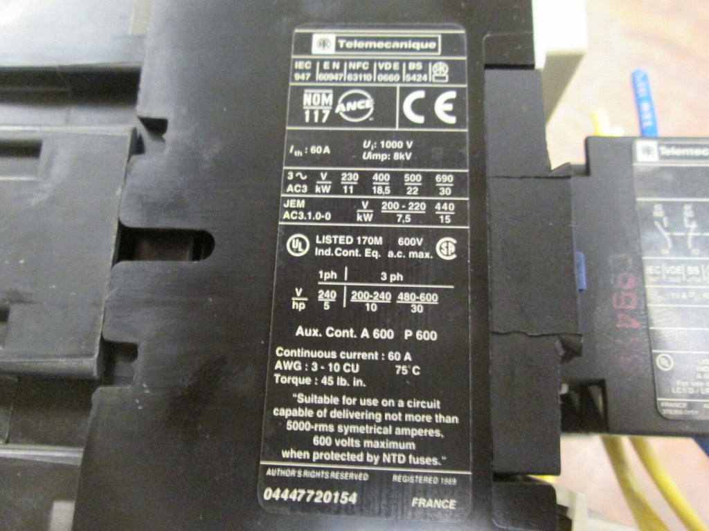 Telemecanique Reversing Contactor LC1 D4011 120V Coil 60A 600V Used