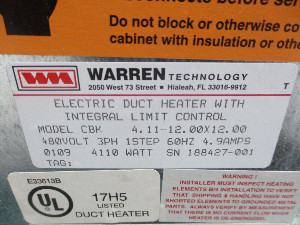 Warren Electrical Duct Heater CBK 4.11-12.00X12.00 480V 3Ph 60...