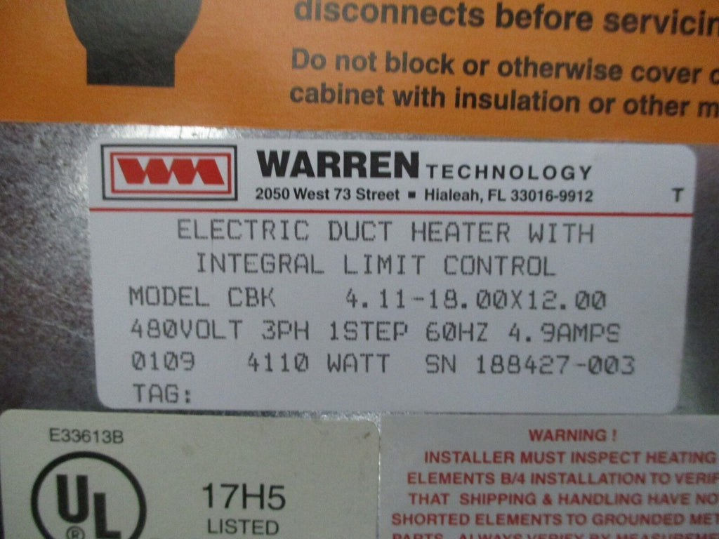 Warren Electrical Duct Heater CBK 4.11-18.00X12.00 480V 3Ph 60Hz 4.9A 1-Step