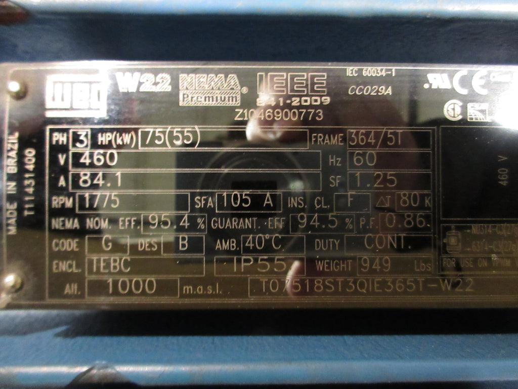 WEG Motor Part #: T07518ST3QIE365T-W22 75 HP 1775 RPM 460 ...
