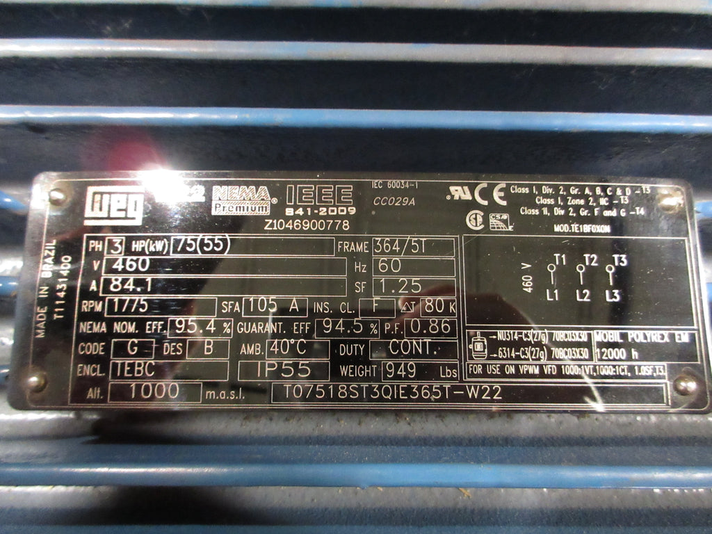 WEG Motor Part #: T07518ST3QIE365T-W22 75 HP 1775 RPM 460 ...