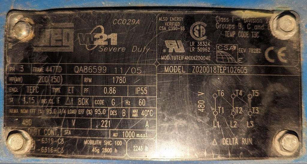 WEG Motor Z020018TEP102605 200HP 1800RPM 480V 221A 3Ph 60Hz 447TD Frame Used