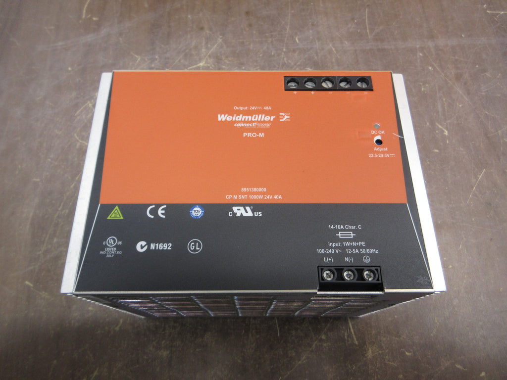 Weidmuller Pro-M Power Supply Part #: 8951380000 1000W Input: 100-240 VAC 12-5 A 50/60 Hz Output: 24 VDC 40 A Used Loc: 59I2-1