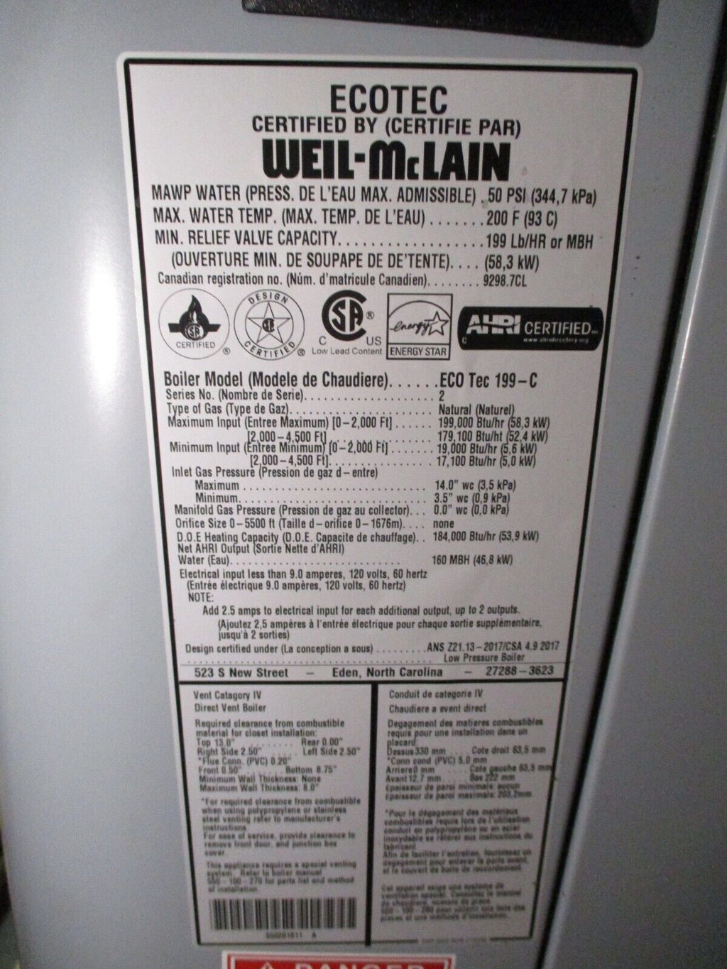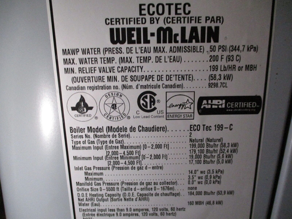 Weil-Mclain Ecotec Natural Gas Boiler ECO Tec 199-C Ser. 2 Inp...