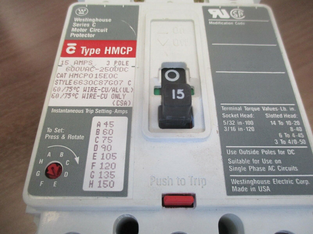 Westinghouse Circuit Breaker HMCP015E0C 15A 600V 3P Used