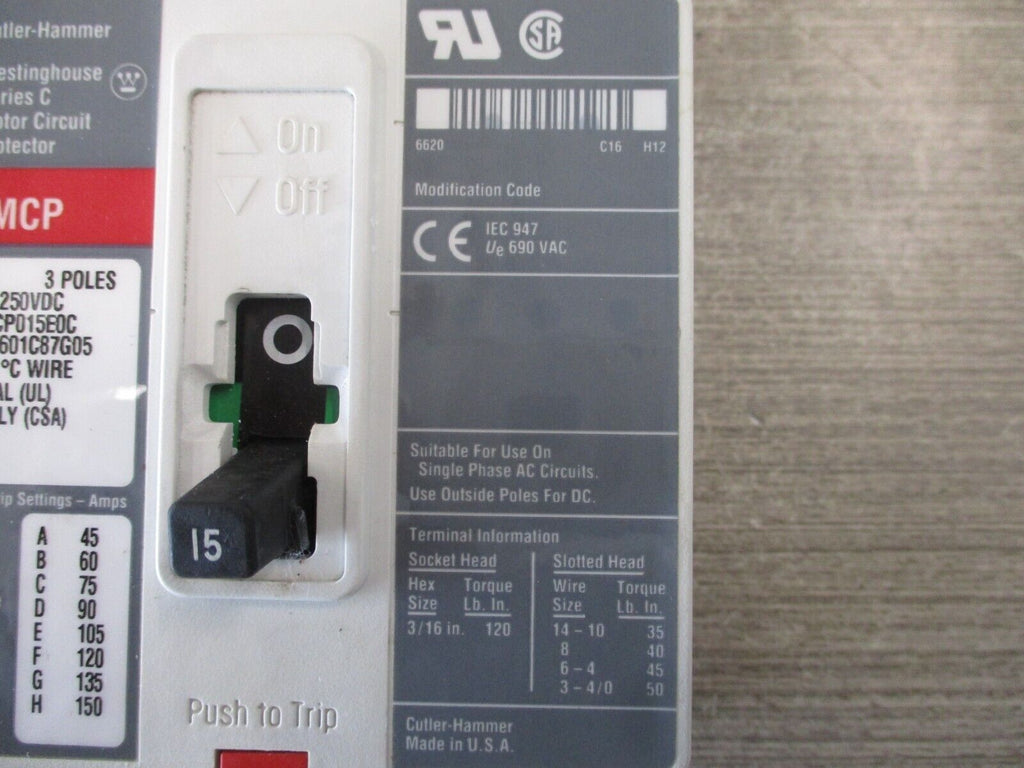 Cutler-Hammer Circuit Breaker HMCP015E0C 15A 600V 3P Used