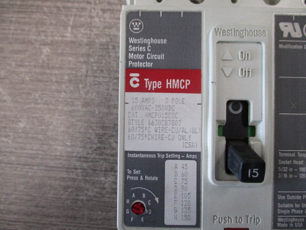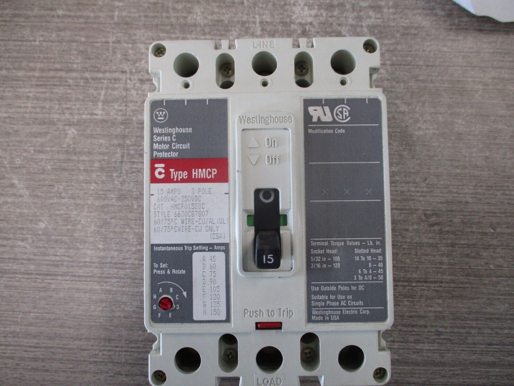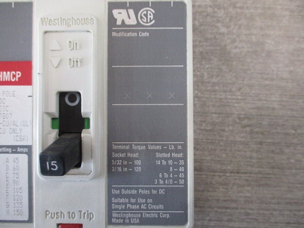 Westinghouse Circuit Breaker HMCP015E0C 15A 600V 3P Used