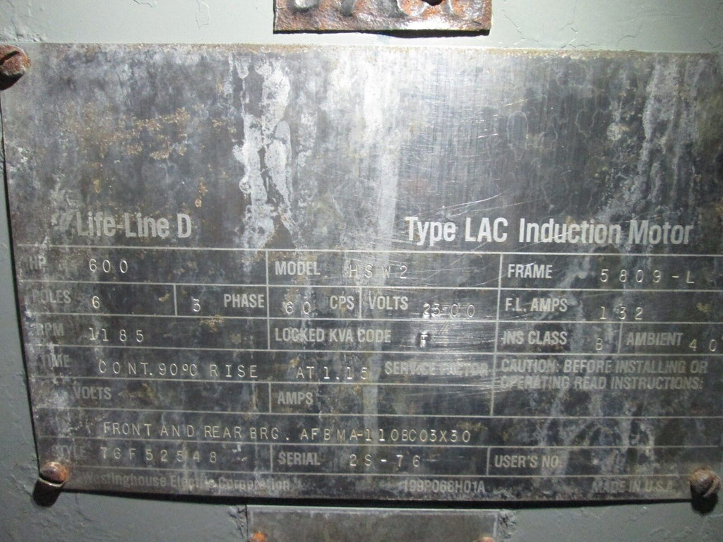 Westinghouse Life-Line D Type LAC Induction Motor HSW2 600HP 1200RPM Used_x000D_ Condition: UsedModel: Life-Line D Type LAC Induction MotorAC Frequency Rating: 60 HzCurrent Type: ACAC Phase: Three PhaseMPN: HSW2Rated Load (HP): 600Brand: WestinghouseNominal Rated Input Voltage: 2300 V Westinghouse Life-Line D Type LAC Induction Motor HSW2 600HP 1200RPM Used Condition: UsedModel: Life-Line D Type LAC Induction MotorAC Frequency Rating: 60 HzCurrent Type: ACAC Phase: Three PhaseMPN: HSW2Rated Load (HP): 600Brand: WestinghouseNominal Rated Input Voltage: 2300 V Westinghouse Life-Line D Type LAC Induction Motor Part #: HSW2 600HP 1185RPM 2300V 132A 60Hz 3Ph 6P 5809-L Frame Used LOC AB11-36 / AB38A1
