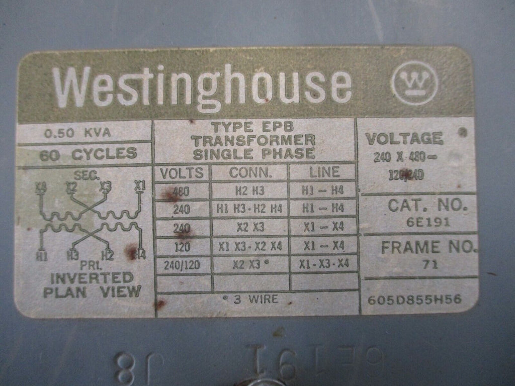 Westinghouse Type EPB Transformer 6E191 0.50 KVA Pri:240/480V Sec:120/240V 1Ph