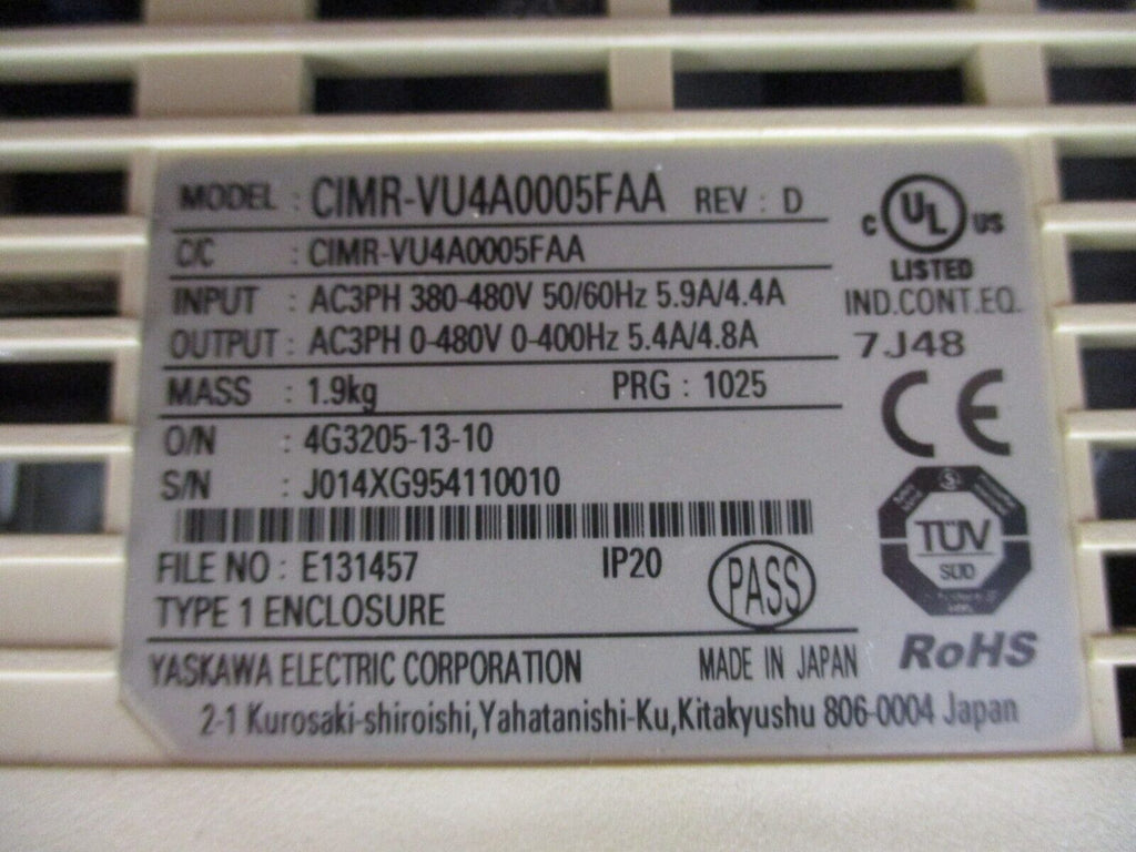 Yaskawa V1000 AC Drive CIMR-VU4A0005FAA Rev. D 3HP 3Ph Used_x000D_ Yaskawa V1000 AC Drive Part #: CIMR-VU4A0005FAA Rev. D 3 HP 3Ph Input:380-480 V50/60 Hz5.9 / 4.4 A Output: 0-480 V0-400 Hz5.4 / 4.8 AUsedLoc: 24G2-1_x000D_ Yaskawa V1000 AC Drive _x000D_ Part #: CIMR-VU4A0005FAA _x000D_ Rev. D _x000D_ 3 HP _x000D_ 3Ph _x000D_ Input:_x000D_ 380-480 V_x000D_ 50/60 Hz_x000D_ 5.9 / 4.4 A _x000D_ Output: _x000D_ 0-480 V_x000D_ 0-400 Hz_x000D_ 5.4 / 4.8 A_x000D_ Uséd_x000D_ _x000D_ _x000D_ _x000D_ _x000D_ _x000D_ _x000D_ _x000D_ _x000D_ _x000D_ _x000D_ _x000D_ _x000D_ Loc: 24G2-1_x000D_