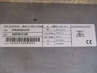 York AC Drive AYK401601132 15HP 3Ph w/ Keypad *Broken Cover & Keypad Mount* Used_x000D_ Condition: UsedBrand: YORKMPN: AYK401601132Maximum Load: 15 HPType: General Purpose AC Drive York AC Drive AYK401601132 15HP 3Ph w/ Keypad *Broken Cover & Keypad Mount* Used Condition: UsedBrand: YORKType: General Purpose AC DriveMaximum Load: 15 HPMPN: AYK401601132York AC Drive Part #: AYK401601132 15 HP 3Ph Input: 380-480 V 21.5 A 48-63 Hz Output: 0-U1 V 23 A 0-250 Hz w/ Keypad *Broken Cover & Keypad Mount* Used Loc: AB11-7070 / AB8F2