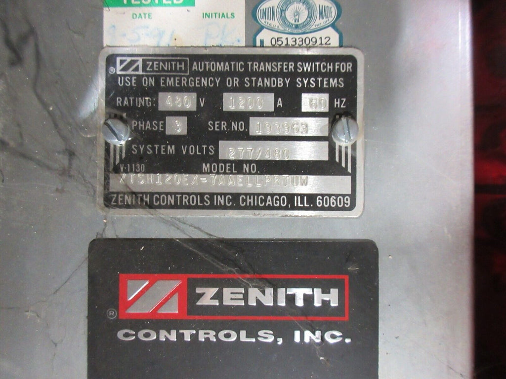 Zenith Automatic Transfer Switch ZTSH120EX-7AAELLPRTUW 1200A 480V 60Hz 3PH Used