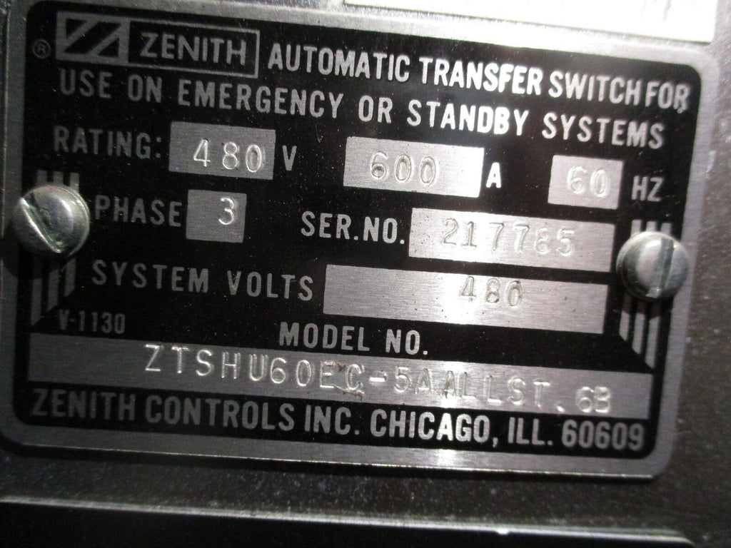 Zenith Automatic Transfer Switch ZTSHU60EC-5AALLST.6B 600A 480V 60Hz 3Ph Used
